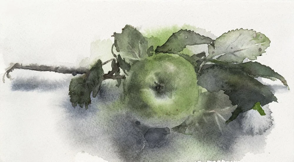 Wendy Artin, Green Apple Branch, 11x20 cm, watercolor, 2025