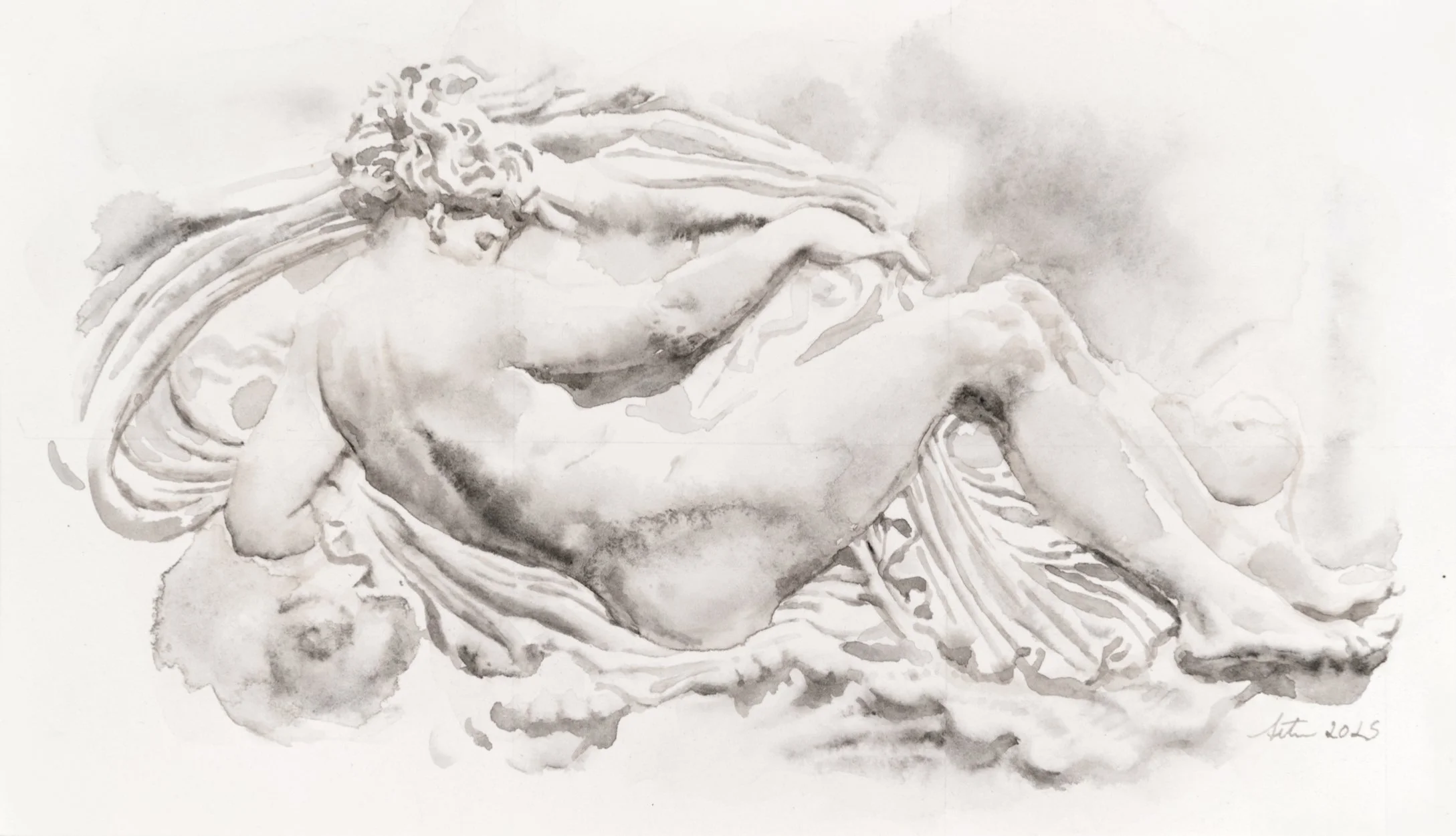 Wendy Artin watercolor of small leggy Nymph from Jean Goujon's bas relief sculpture, in exhibition Cornucopia XXV at Gurari Collections 2025