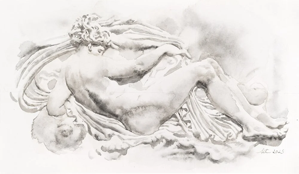 After the Bacchante by Clesinger, 16" x 40", watercolor on handmade rag paper, 2019, copyright Wendy Artin